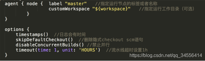 - 整个流水线都是由pipeline这个块组成的,然后里面有一些标签,比如agent指定在哪个节点上运行这条流水线
