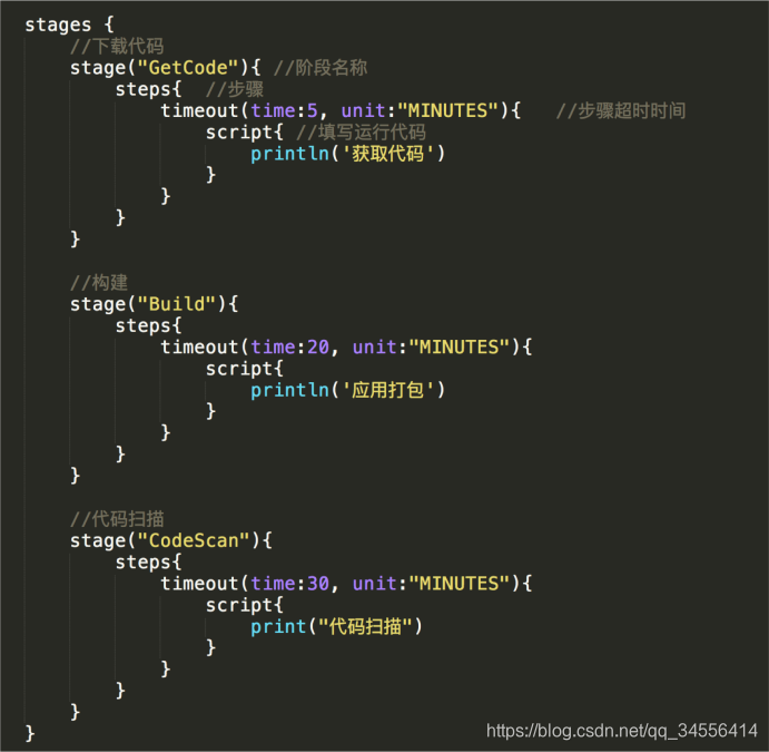 - 指定stages{}(stages包含多个stage,stage包含steps。是流水线的每个步骤)
