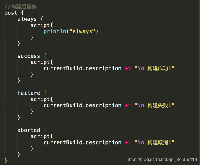 构建后的操作,这个非常的重要,这是固定的格式,可以按照这个代码块模板去写,比如成功失败了发个邮件通知