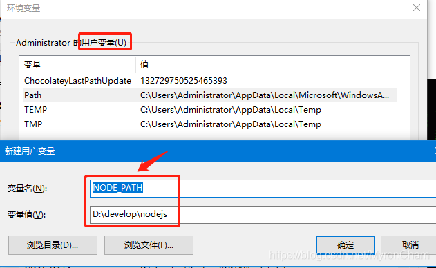 用户变量下,新建用户变量。变量值写node.js的安装路径即可