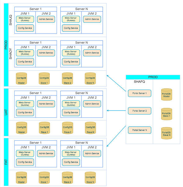 各套环境互相是独立的,数据库可独立,服务器可独立。单套环境间是需要有网络依赖的,另PortalService需要能访问到各环境的MetaService(ConfigService)地址。