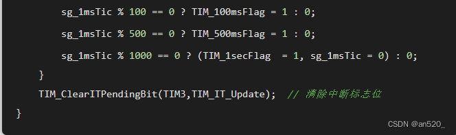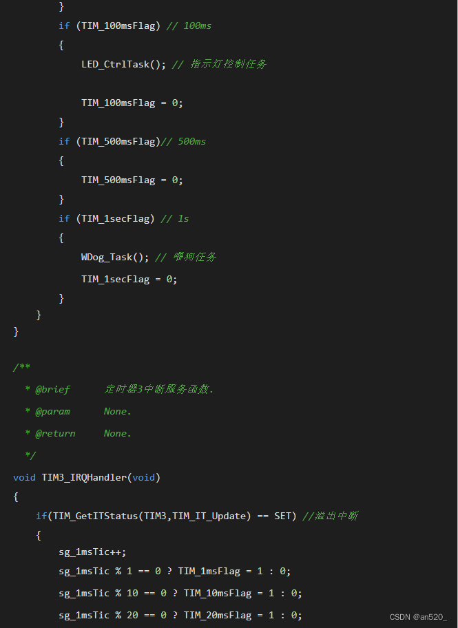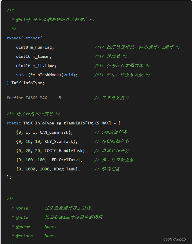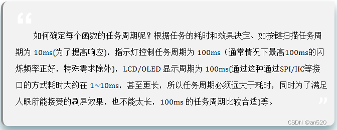 该设计方案需要使用一个定时器,一般情况下定时1ms即可(定时时间可随意定,但中断过于频繁效率就低,中断太长,实时性差),因此需要考虑到每个任务函数的执行时间,建议不能超过1ms(能通过程序优化缩短执行时间则最好优化,如果不能优化的,则必须保证该任务的执行周期必须远大于任务所执行的耗时时间),同时要求主循环或任务函数中不能存在毫秒级别的延时。