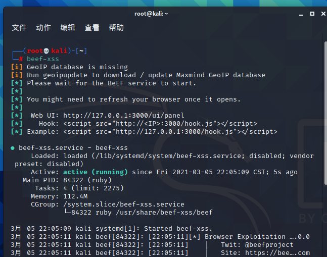 打开kalilinux,在终端输入beef-xss打开beef工具
