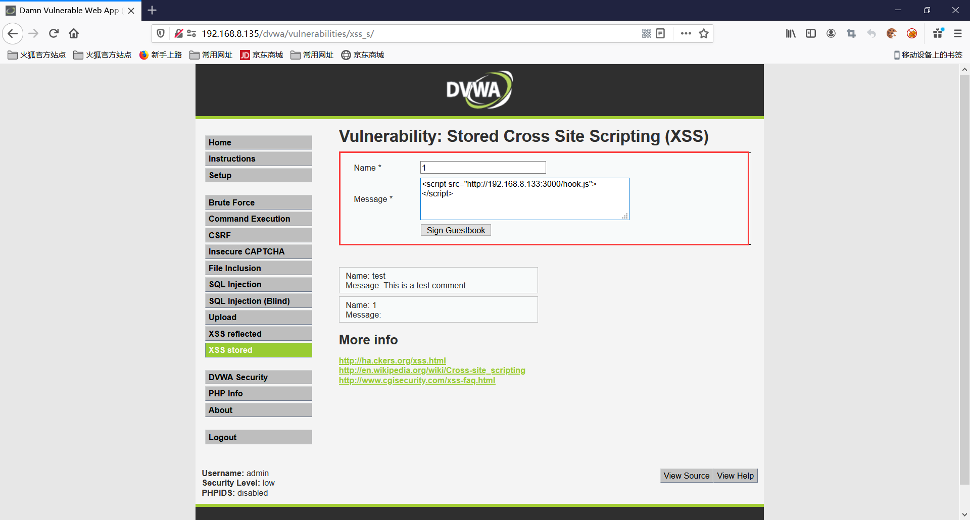 我们使用win10作为攻击机进入到OWASP Broken Web Apps VM v1.2的dvwa的XSS stored模块