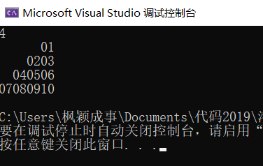 总结一下我的方法:由于数字都是连续递增的,所以我们先创建一个等于1的变量,每打印一次就把它加一,这样我们的关注点就只在于打印的格式了。按照格式我们需要把打印的内容分为两种:一种是空格或者别的间隔符,循环打印;第二种是数字,在前面的基础上也是循环打印即可。总之,还是比较简单的。剩下和样例对称的两种就不多说了。