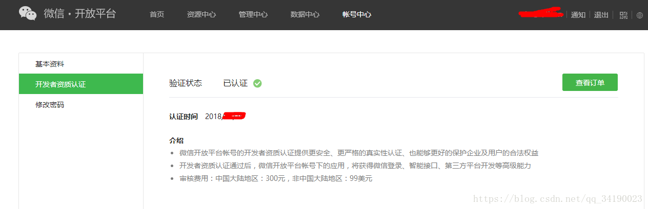 3、申请开发者资质认证、填写相关资料、填写发票、支付认证金额。提交并等待认证结果