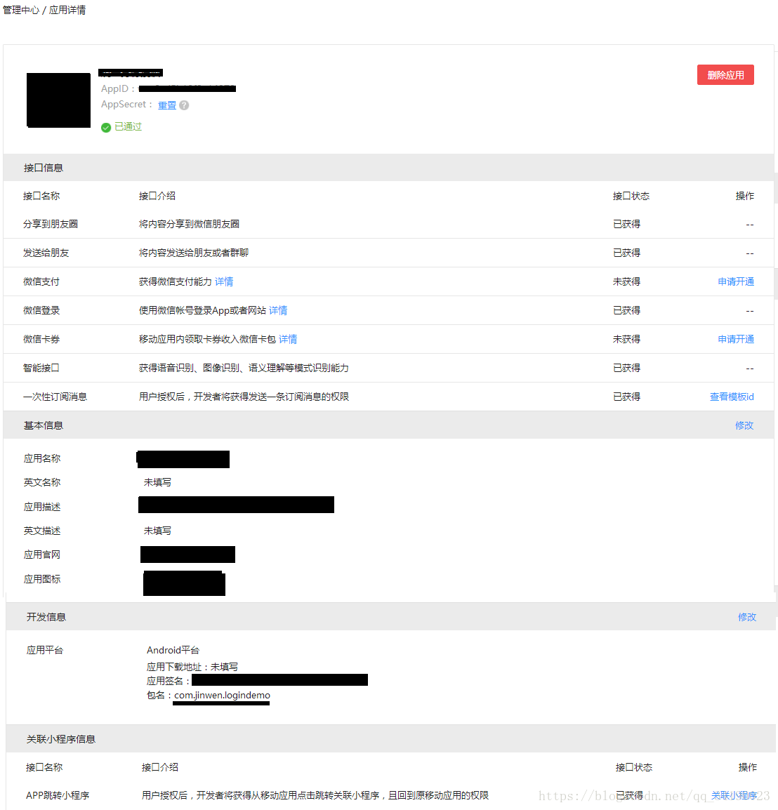 成功创建应用并审核通过后,点击应用右方“查看”可以查看应用详情。