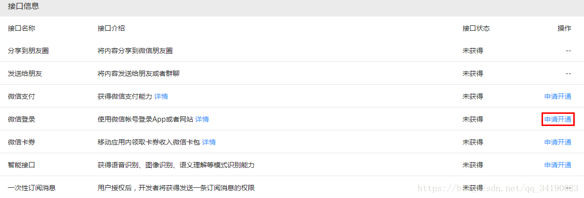 选中“微信登陆”接口,点击右方申请开通,开通微信登陆功能。