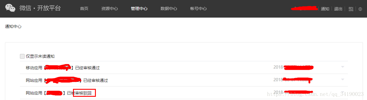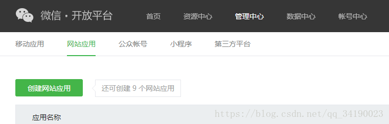 进入开放平台首页(https://open.weixin.qq.com),点击上方“管理中心”,点击“网站应用”,点击“创建网站应用”