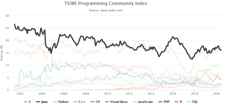 上面这幅图是几个热门编程语言(Java、C、Python、JavaScript 等等)近些年来的增长趋势。可以看得出,Java 霸占这份榜单很多年,并且还会持续更久。