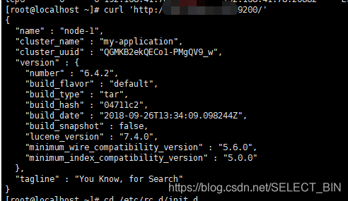 如果没有什么问题话,就可以安全生成了;然后执行curl 'http://自己配置的IP地址:9200/' 命令,就出现下面的结果