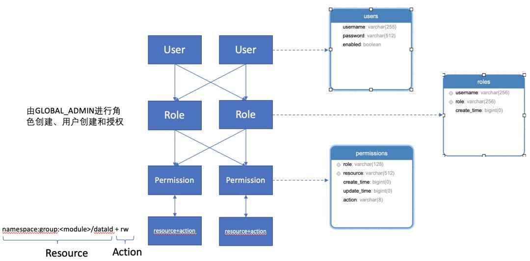Nacos 自带的鉴权系统使用的是 RBAC 模型,可以在网上查询相关的资料。