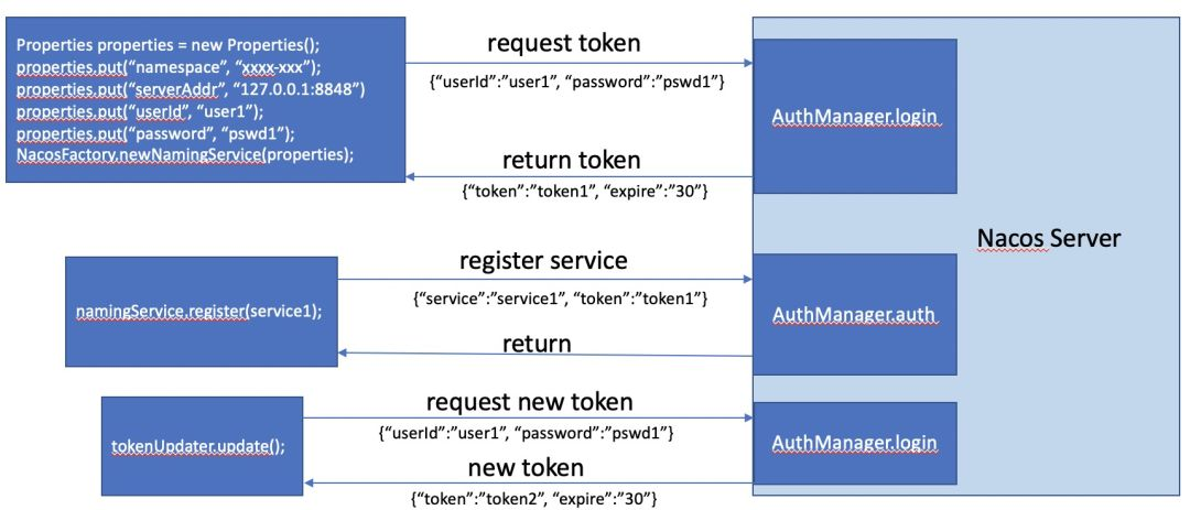 对于用户来说,不管是在控制台还是在客户端,都是上传用户名和密码来获取一个 token ,然后后续的每一次到 Nacos 的请求都会带上这个 token 来表明身份。这个 token 会有一个失效时间,对于控制台来说,只需要直接提示用户重新登录即可,对于客户端则需要有一个定期到 Nacos 刷新 token 的逻辑。