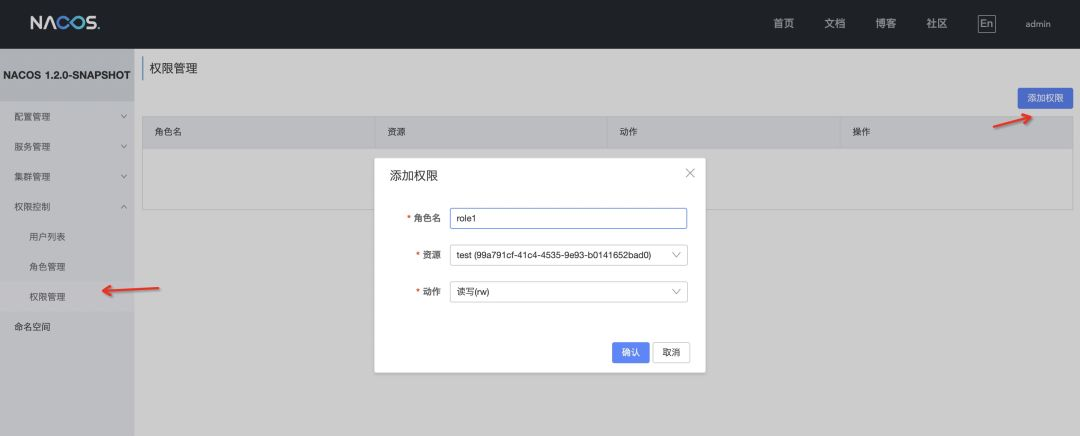 在“添加资源”对话框里,可以选择绑定的角色,命名空间资源以及对应的动作类型,例如在上图中,我们给角色 role1 绑定命名空间test的读写权限。然后又因为刚刚我们是将 user1 绑定到了 role1 上,那么 user1 这个用户就可以对 test 这个命名空间的资源进行读写操作了。