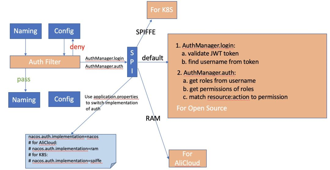 整体的模块设计是尽量将鉴权的逻辑抽象出来,不在服务发现模块或者配置管理模块添加相关的逻辑。通过配置文件可以选择当前使用的鉴权系统。Nacos 自带的认证系统使用 JWT Token ,自带的鉴权系统使用的是 RBAC 。