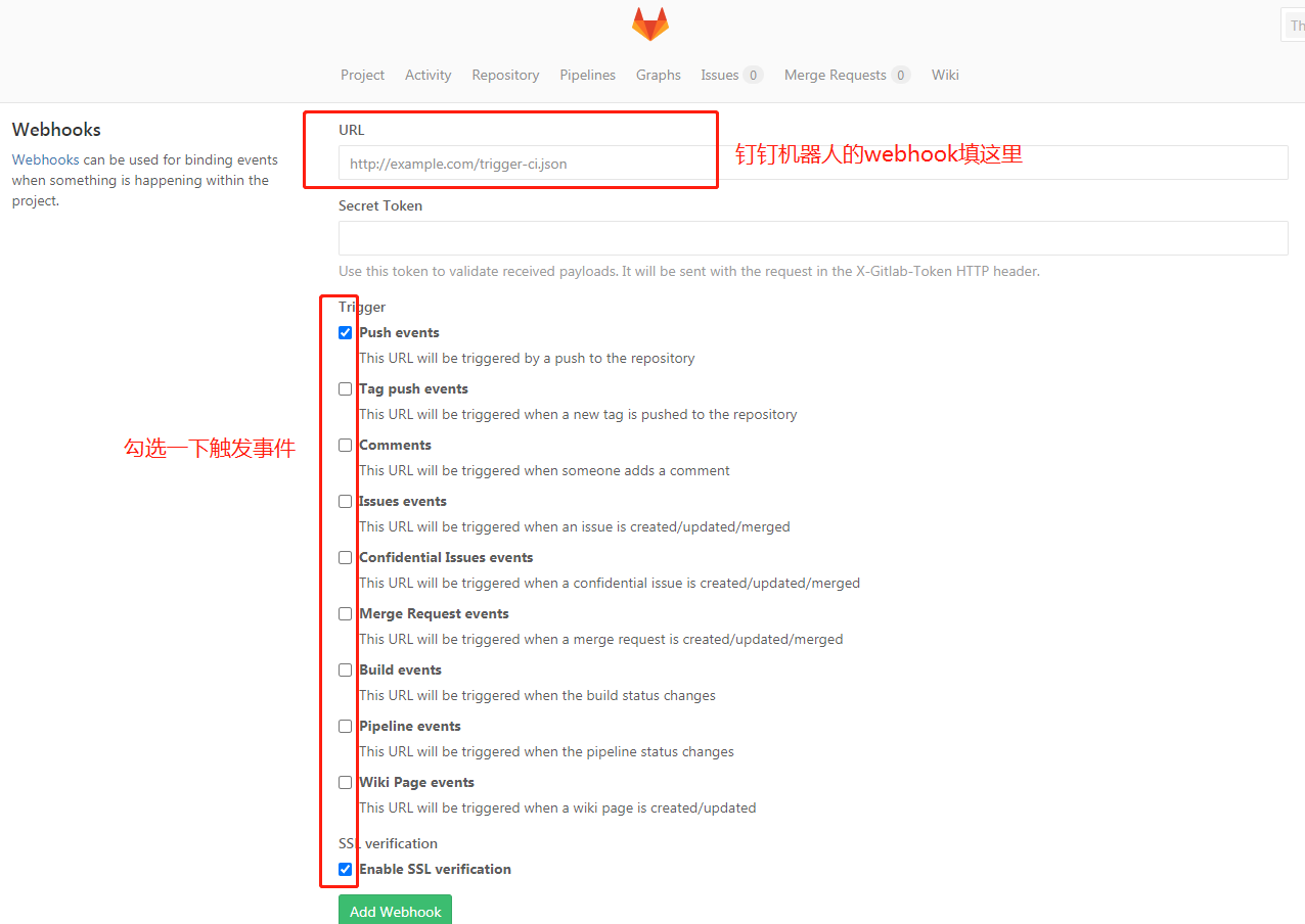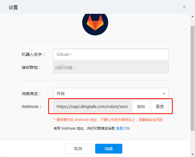 基本原理就是 1.开发人员GitLab提交代码或合并分支 -> 2.触发webhook事件 -> 3.GitLab通过URL方式调一下钉钉的机器人通知接口。