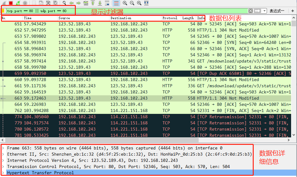 tcp.srcport==80 只显示TCP协议的源主机端口为80的数据包列表