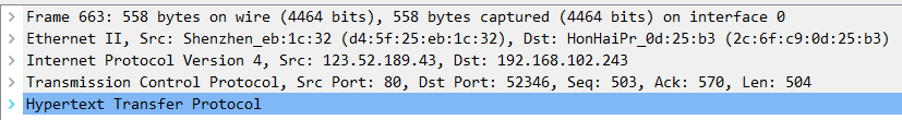 Packet Details Pane(数据包详细信息), 在数据包列表中选择指定数据包,在数据包详细信息中会显示数据包的所有详细信息内容。数据包详细信息面板是最重要的,用来查看协议中的每一个字段。各行信息分别为