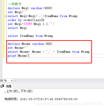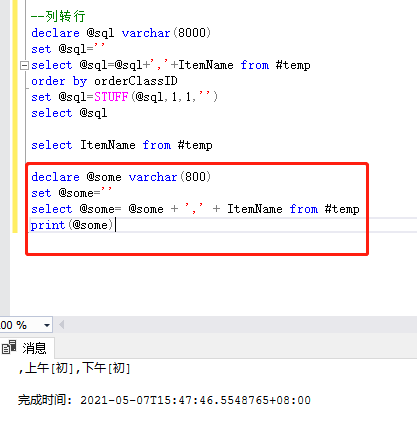 其实根据#temp中的内容,select已经执行了2次查询,并且结果保存在了@sql中,最后的select无非是把结果取了出来,并且去掉了前面的逗号