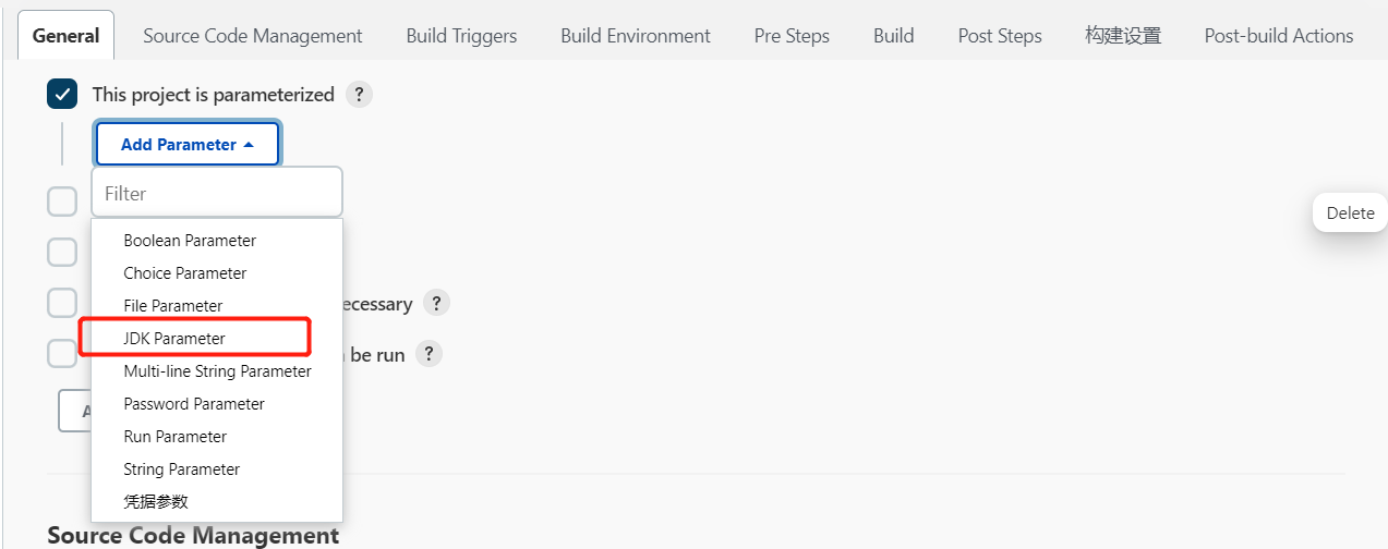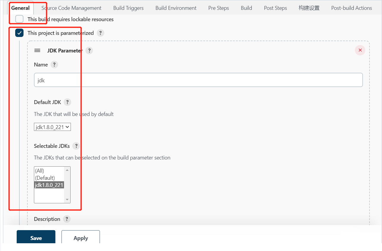 5.在Job工程配置中,启用参数化配置, General ,勾选 This project is parameterized,新增JDK Parameter:
