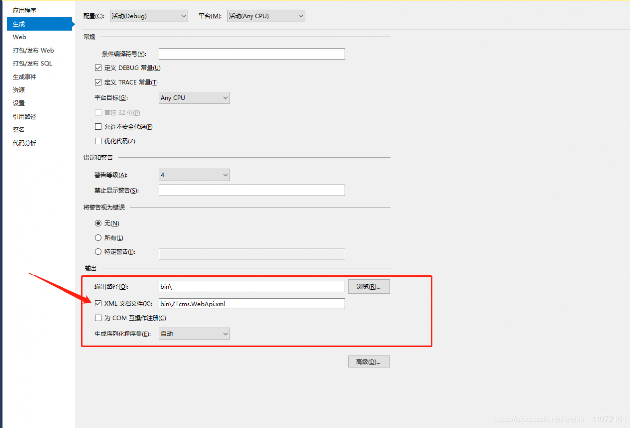 }代码写完后,右击解决方案的当前项目属性,在生成栏目中,生成XML文档文件