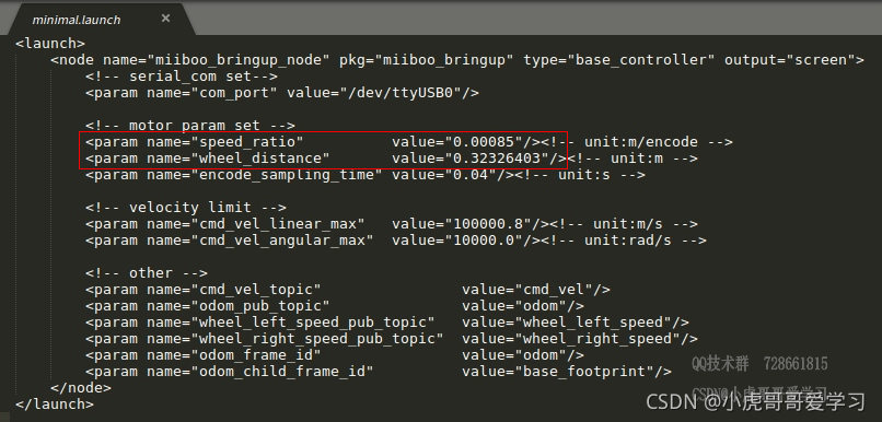 里程计的参数存放在miiboo_bringup/launch/minimal.launch文件中,如图53所示。