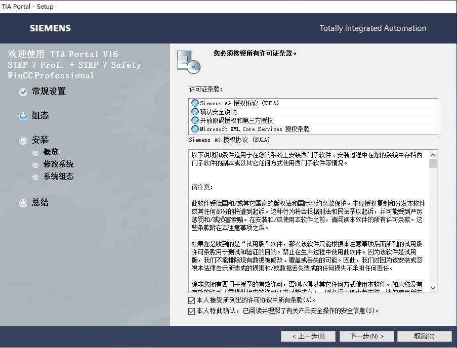 勾选“接受许可协议中的所有条款”和“确认安全信息”。