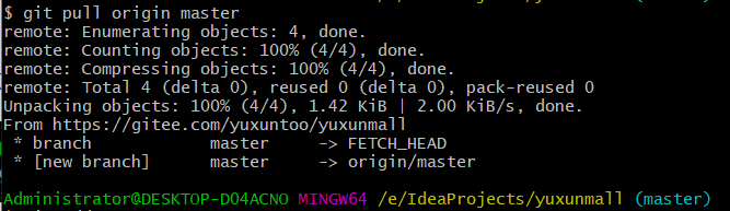 5、输入命令: git pull origin master,将码云上的仓库pull到本地文件夹