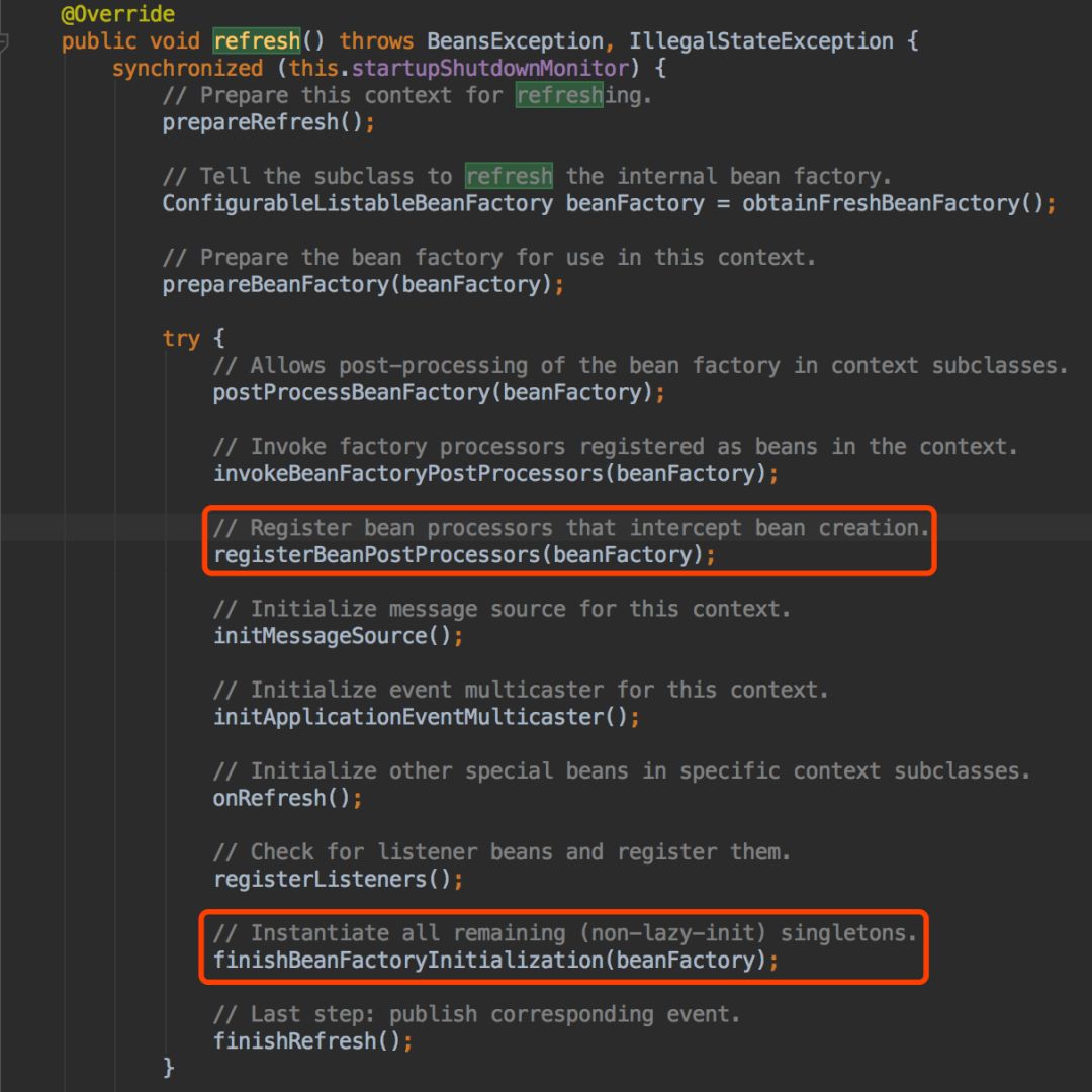 那代码是如何运行到AutowiredAnnotationBeanPostProcessor类中的呢?Spring容器在启动的时候会执行AbstractApplicationContext类的refresh方法,这个方法相信大家都已经很熟悉了,refresh方法的主要代码如下图所示。