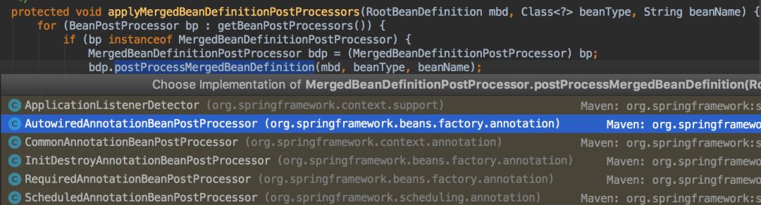 在这段代码中会执行applyMergedBeanDefinitionPostProcessors(mbd, beanType, beanName),深入到这个applyMergedBeanDefinitionPostProcessors方法中,具体代码如下图。