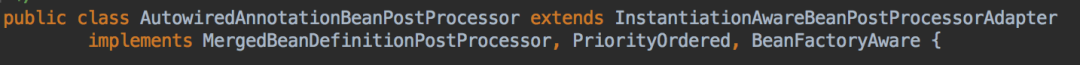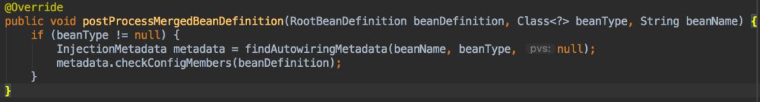 查看postProcessMergedBeanDefinition方法的具体实现类,会发现这里调用的是AutowiredAnnotationBeanPostProcessor类的postProcessMergedBeanDefinition方法,也就是开头介绍的在这个方法中完成了对注入元素注解的预解析。