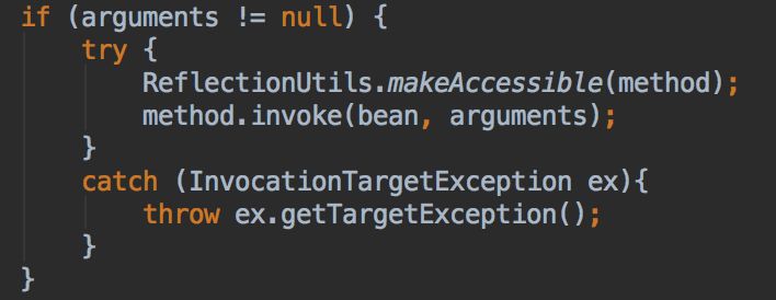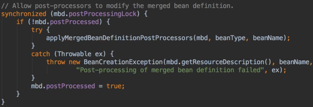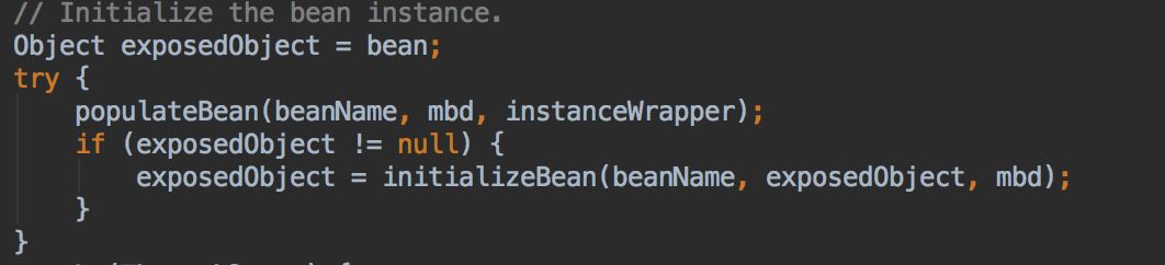 refresh方法中registerBeanPostProcessors(beanFactory)完成了对AutowiredAnnotationBeanPostProcessor的注册,当执行finishBeanFactoryInitialization(beanFactory)方法对非延迟初始化的单例bean进行初始化时,会执行到AbstractAutowireCapableBeanFactory类的doCreateBean方法,在这个方法中有如下这么一段代码。