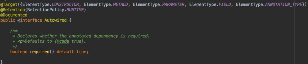 以下是@Autowired注解的源码,从源码中看到它可以被标注在构造函数、属性、setter方法或配置方法上,用于实现依赖自动注入。