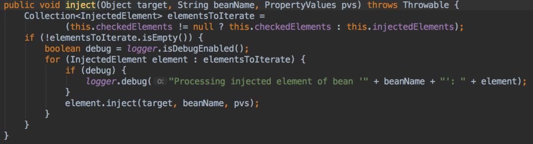 metadata.inject(bean, beanName, pvs)代码的执行会进入如下inject方法中,在这里完成依赖的注入。