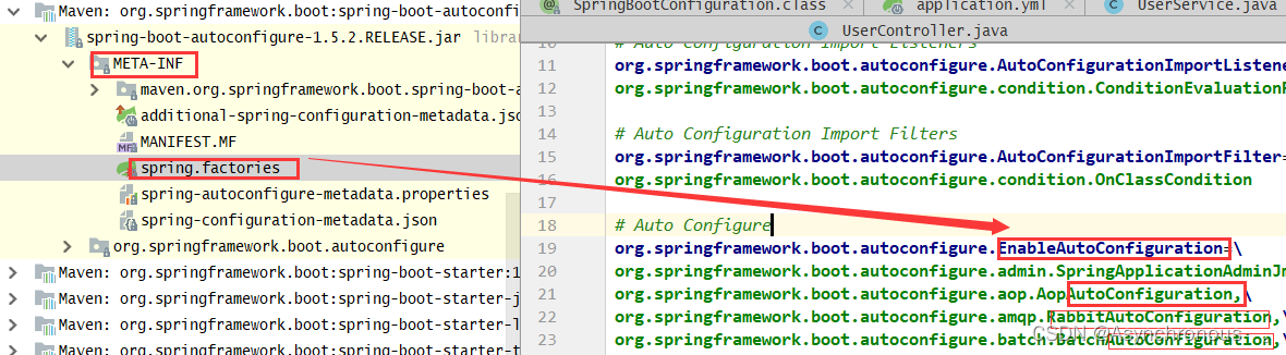 这是SpringBoot中Autoconfiguration依赖包下MENT-INF/spring.factories的一部分,通过加载Autoconfiguration的配置,通过反射来实例化对应的@Configuration,再判断是否需要加载具体信息。