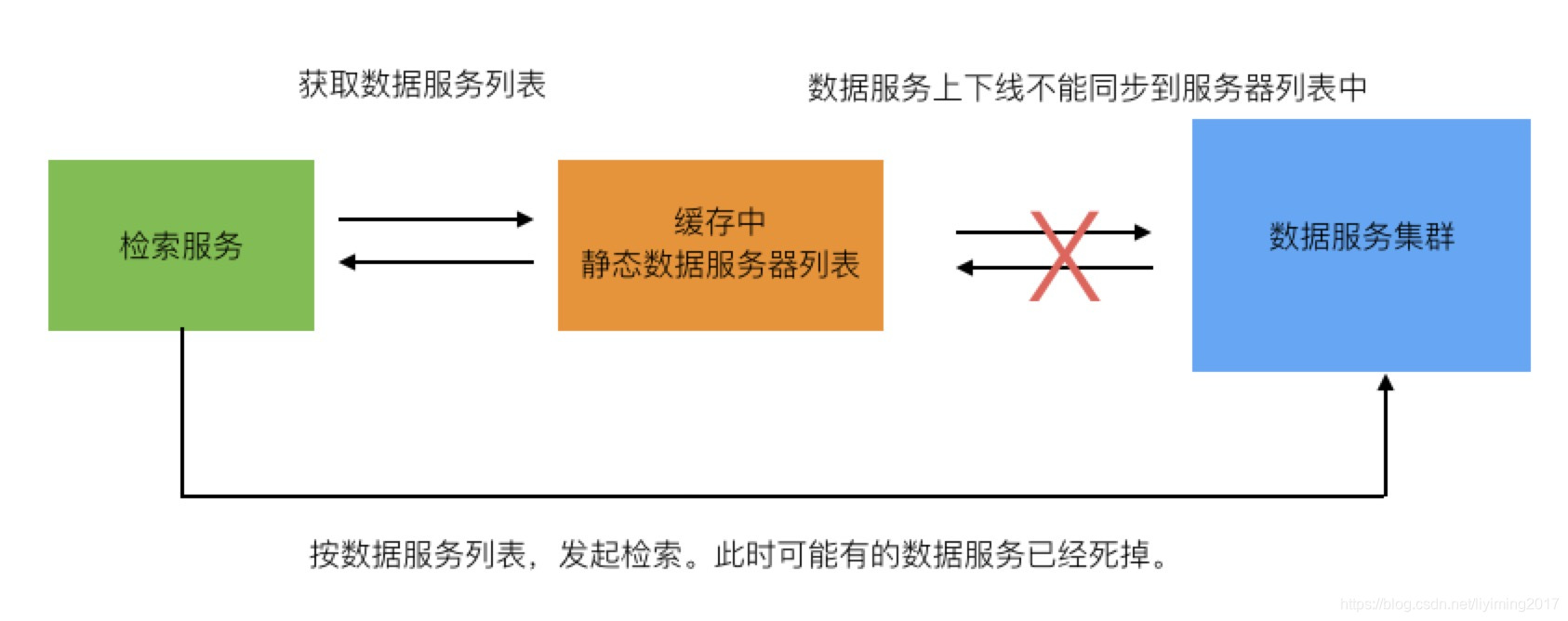 数据服务器之前没有做分布式协调。对于检索服务器来说,并不知道哪些数据服务器还存活,所以检索服务器每次检索,都会等待100台机器返回结果。但假如100台数据服务中某一台死掉了,检索服务器也会长时间等待他的返回。这导致了检索服务器积累了大量的请求,最终被压垮。当所有的检索服务器都被压垮时,那么网站也就彻底不可用了。