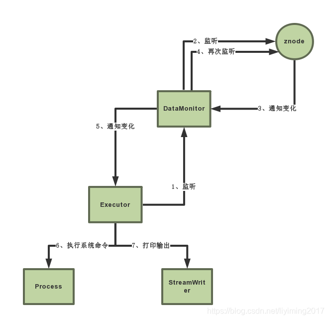 * 自己作为DataMonitor的listener。当dm监控到变化时会调用executor执行业务操作