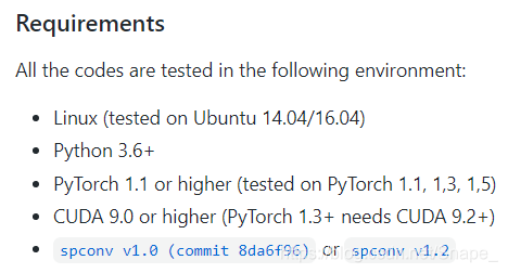 我自己的环境是Ubuntu18.04,python3.7,CUDA10,pytorch1.3,注意pytorch版本要CUDA一致,安装pytorch的时候会自动安装python下的cudatoolkit和cudnn。sponv是一个空间稀疏卷积库,提供了两个版本,这个是1.0: