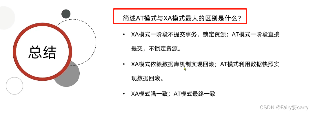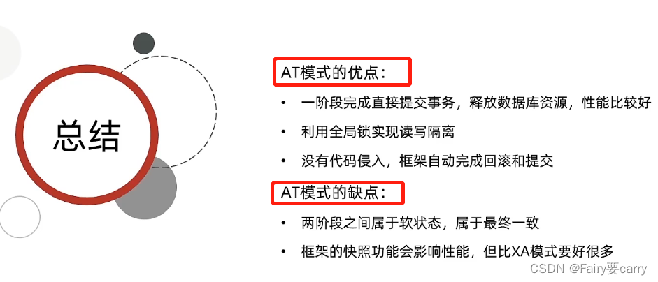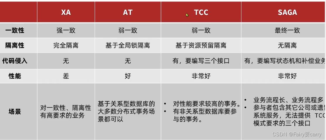 优点:1.TCC第一阶段直接提交事务,提交完直接释放数据库资源,AT的话也是直接执行,但是使用了全局锁来保存事务操作的一个状态,保证其他事务争夺不了,XA的话第一阶段就垃圾了,不会提交sql业务,需要把状态给到TC事务协调者进行判断是否回滚还是提交(是一提交或者回滚就是全局那种);