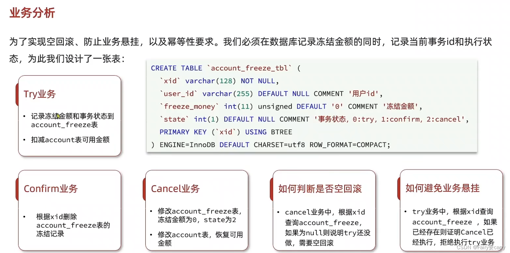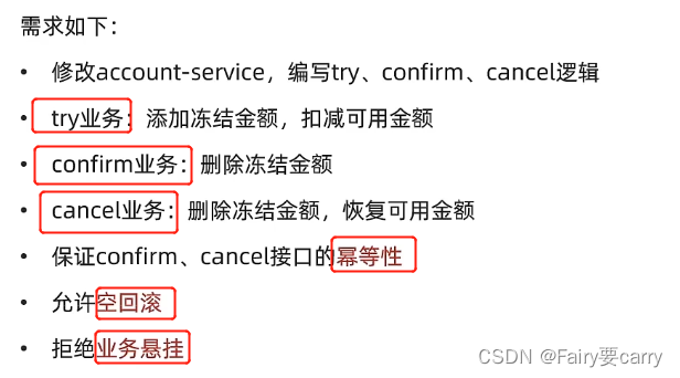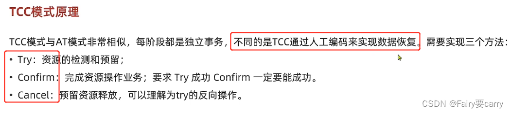 TCC模式的关键在于有代码侵入:需要考虑Comfirm成功提交和Cancel数据回滚的编写