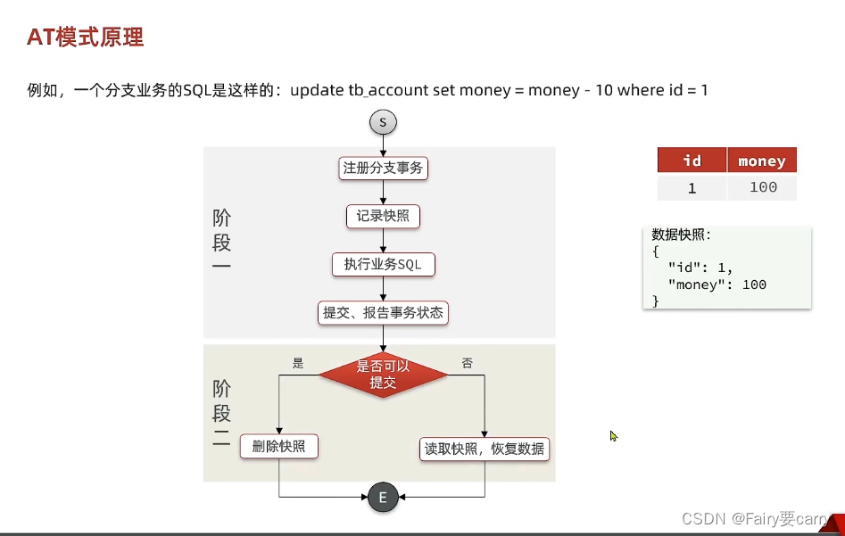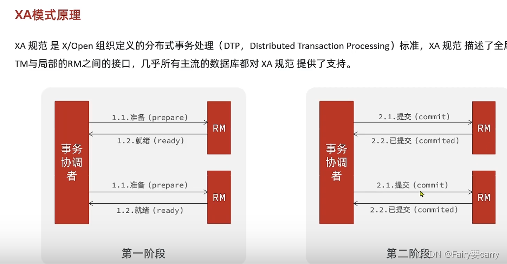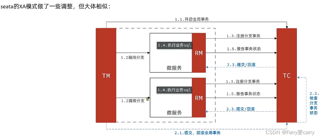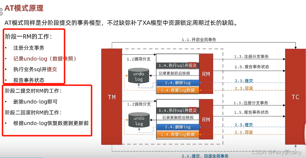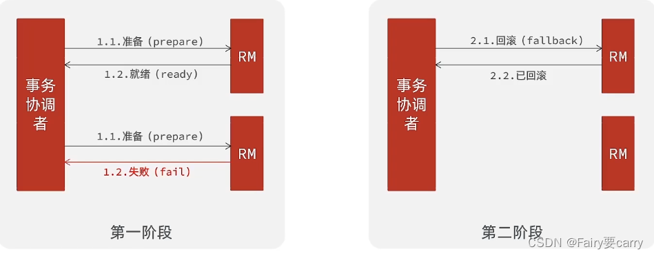 第一阶段:RM资源管理器向TC事务协调者注册分支事务,然后发送执行sql(不提交)后的状态(失败/就绪),有利于保证ACID——>第二阶段:TC根据状态来判断是否要回滚,如果都成功就让RM事务管理器提交事务,如果失败就回滚;