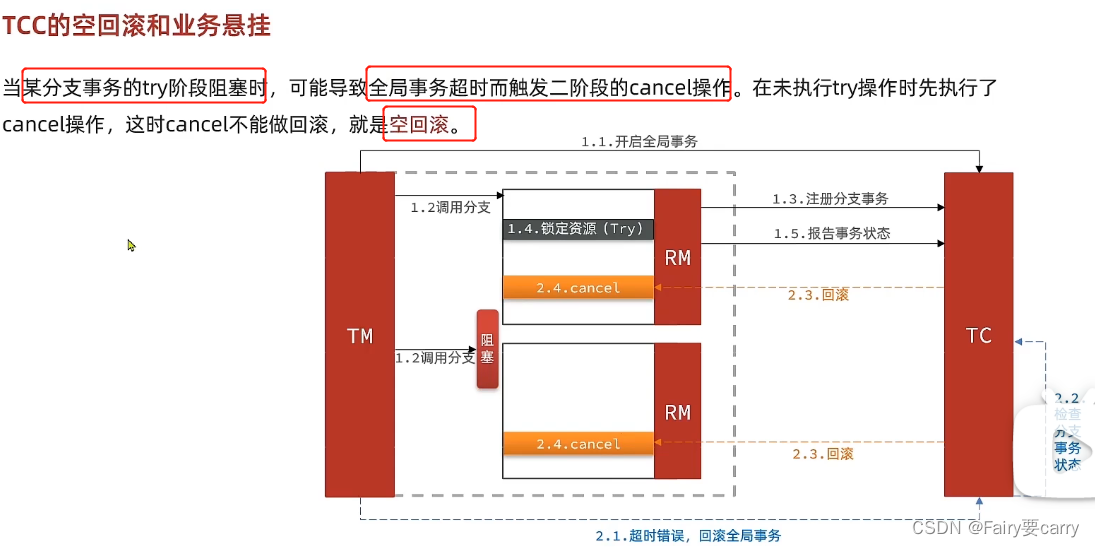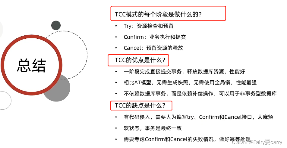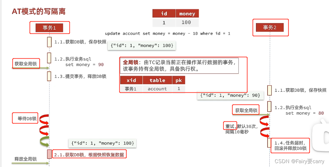 而TCC模式,为什么就不需要锁了呢?我们AT模式是利用全局锁来保证一致性的——>执行sql后提交前上一道全局锁,那么其他事务的sql就执行不了进行自旋,超时就释放DB锁,而TCC解决:利用了每个事务都是预留资源进行处理——> 第一个事务冻结的金额和第二个事务冻结的金额是不一样的,跟其他事务是没有关系的,那么回滚事务也是跟其他事务不影响的,不需要加锁(类似Semaphore)