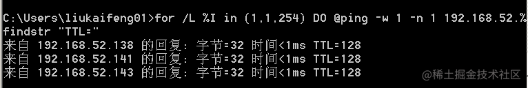for /L %I in (1,1,254) DO @ping -w 1 -n 1 192.168.52.%I | findstr "TTL="