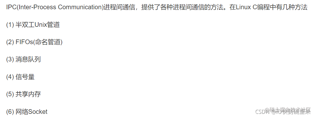 IPC(Inter-Process Communication,进程间通信),进程间通信是指两个进程的数据之间产生交互。进程间通信主要方式有共享内存、消息队列、管道等。其中共享内存主要用于同一计算机内进程间通信,消息队列和管道主要用于分布式环境(通信进程位于通过网络连接的不同计算机)。