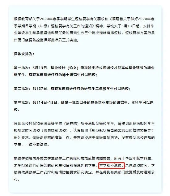 今天中午,华侨大学发布的返校复学通知中明确:所有非毕业年级本科生、未承担紧迫科研任务的研究生和目前在境外的学生,本学期不返校。