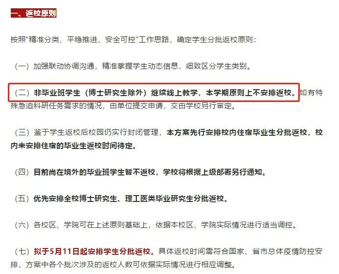 昨晚,暨南大学发布返校通知,其中提到“非毕业班学生(博士研究生除外)继续线上教学,本学期原则上不安排返校”。如果有特殊情况需要返校,必须提交申请,由学校另行决定。