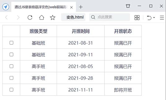 我们需要通过JS实现鼠标悬浮表格对应行变色的效果,效果在文末。