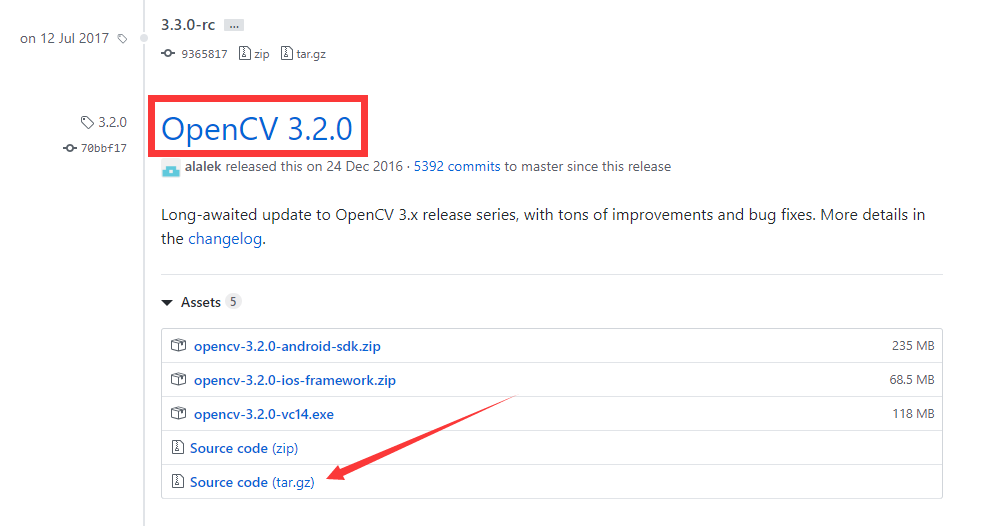 从此处下载OpenCV的3.2.0版本源码:https://github.com/opencv/opencv/releases?after=3.4.0-rc