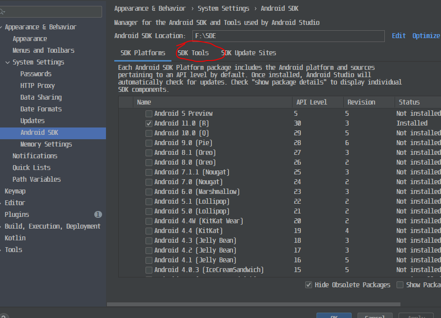 在SDK Manager中将选项卡由SDK Platforms切换至SDK Tools,如图所示: