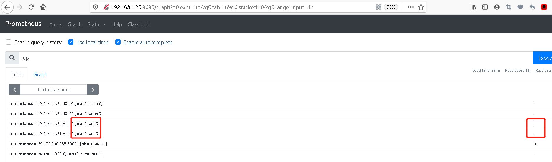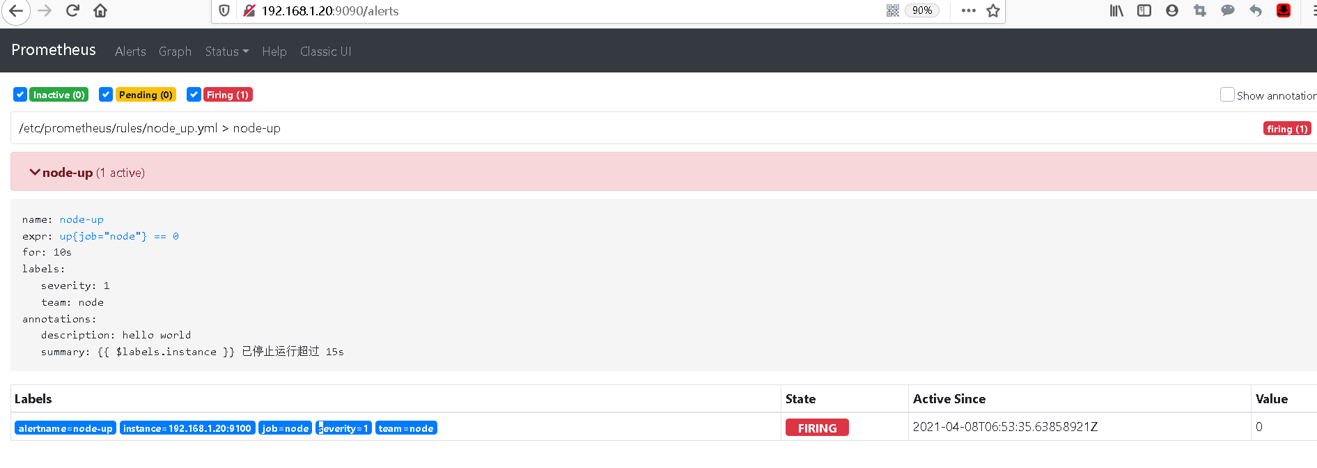 上面我们定义的规则是判断up指标中job=node的值是否为0